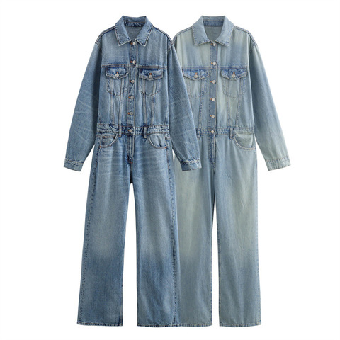 Phụ Nữ Của Cổ Điển Thời Trang Phố Denim Hàng Hóa Rompers Áo Liền Quần Giữa Eo Skinny Phù Hợp Với Thoáng Khí Dài Tay Áo Giản Dị
